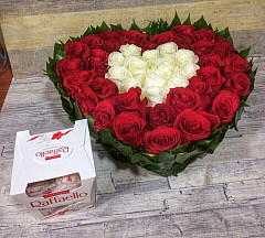 Цветочная композиция выложена в форме сердца, в середине находятся белые розы, обрамленные рядом из красных. Белые цветы издавна считаются отличным способом передать нежность и чистоту, а красные - страстную любовь и желание. Букет прекрасно передает светлую любовь, которую хочет испытать каждая женщина. Возлюбленная обрадуется такому подарку и поймет без слов все, что вы хотите ей сказать. Форма сердца – дополнительный непрозрачный намек, а запах роз поднимает настроение на целый день.